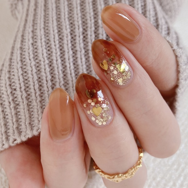 【how to】ブラウンとゴールドハートのバレンタイン透明感ネイル
